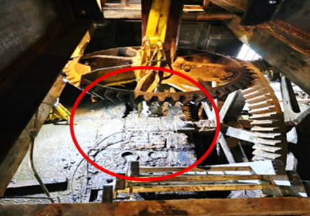The most significant aspect of the repair work was the replacement of the two timber bearing beams that support the waterwheel bearing and gearing mechanism. These can be seen in the 1st photo below with circles highlighting the water damage. We could no longer operate safely with these beams in place. The second photo shows the pit after beams have been removed but not yet replaced.